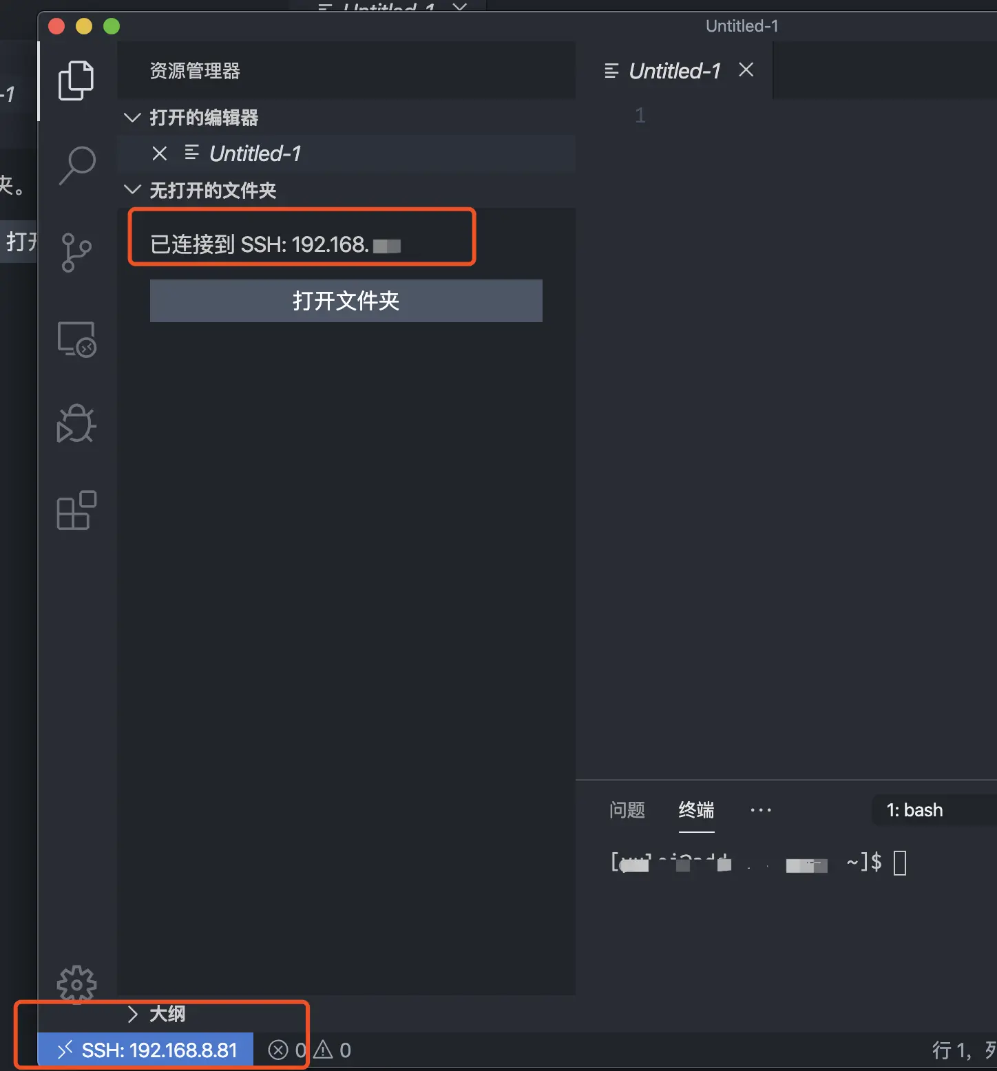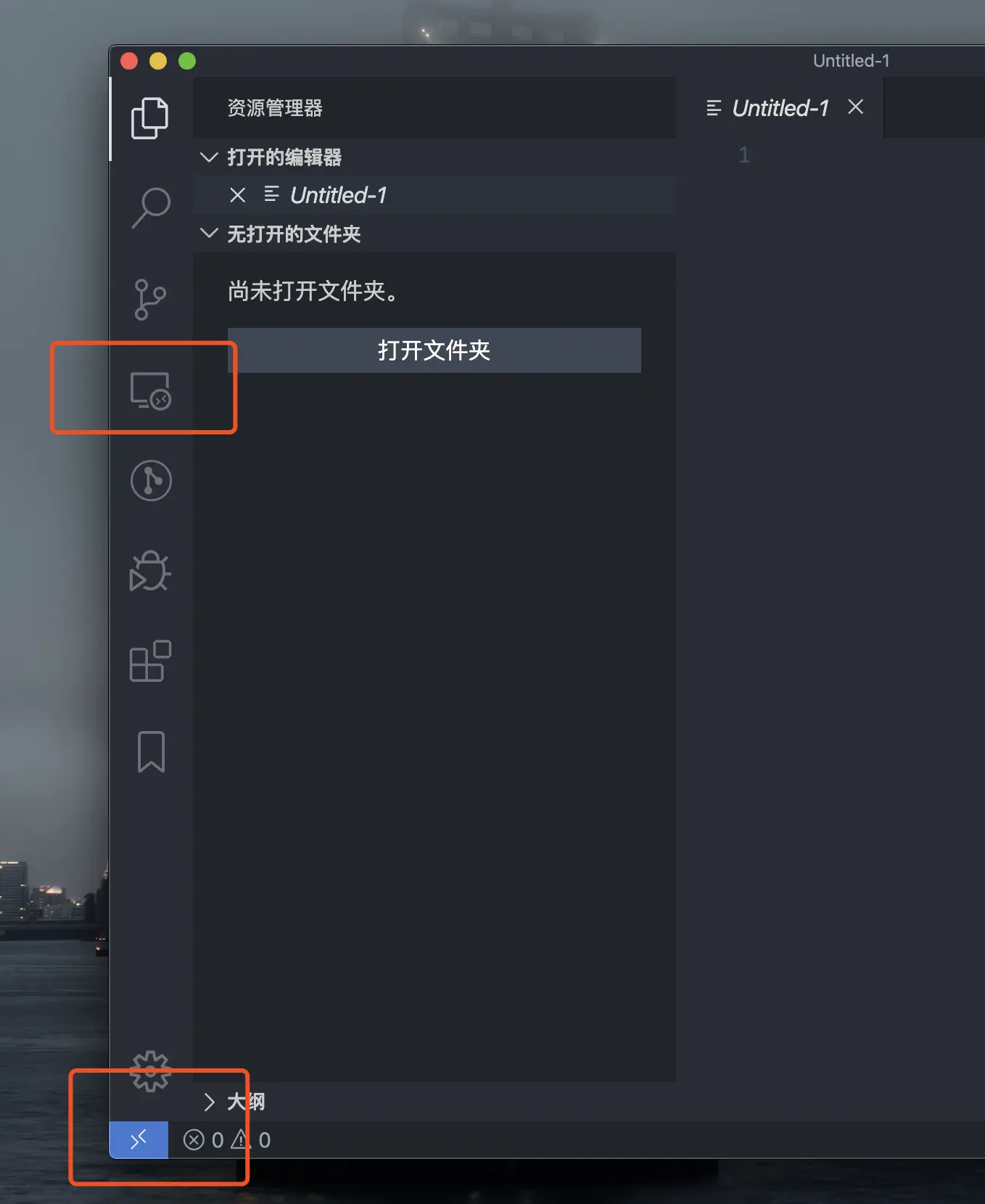 安装完 Remote 插件后,会在 VS Code 编辑器的左下角出现一个连接远程窗口的区域