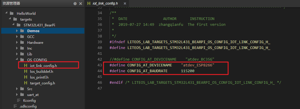 在工程目录中的OS_CONFIG/iot_link_config.h文件中,配置ESP8266设备的波特率和设备名称: