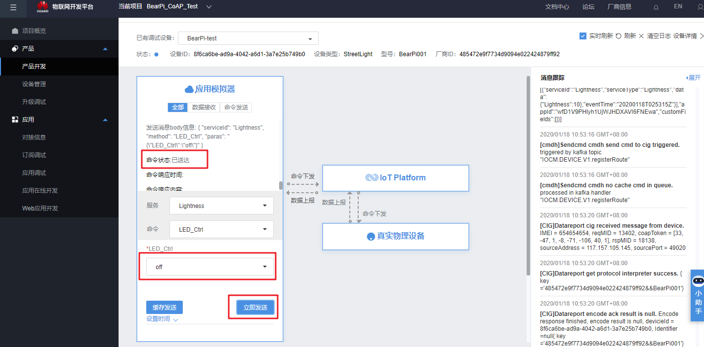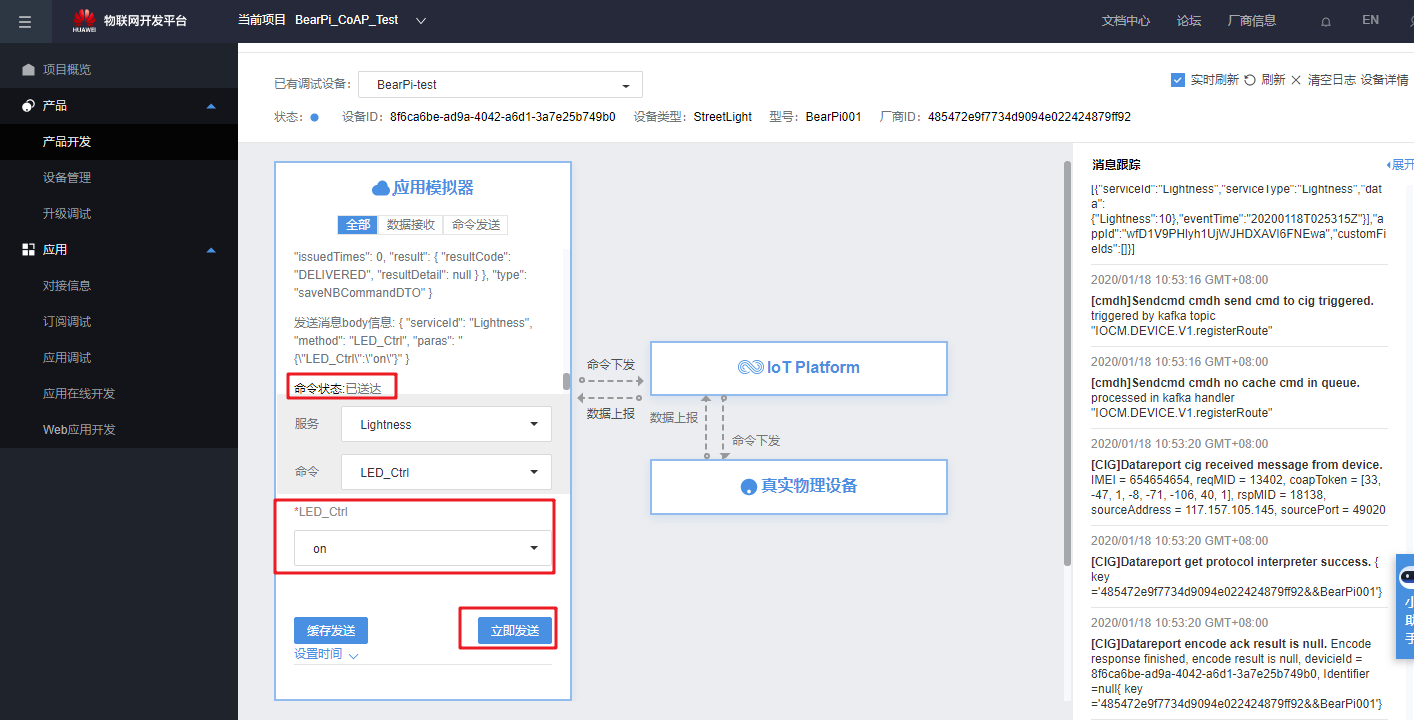 在云端下发“on”命令: