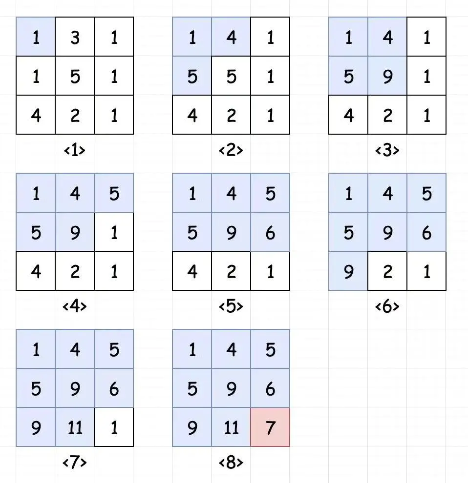 同样,运行上面的代码,我们发现使用的内存过大。有没有什么办法可以压缩内存呢?通过观察我们发现,**在我们自左上角到右下角计算各个节点的最小路径和的过程中,我们只需要使用到之前已经累积计算完毕的数据,**并且不会再次访问之前的元素数据。绘制成图如下:(大家看这个过程像不像扫雷,其实如果大家研究扫雷外挂的话,就会发现在扫雷的核心算法中,就有一处颇为类似这种分析方法,这里就不深究了)