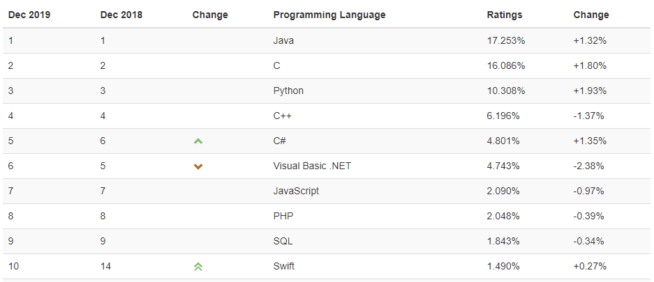位于榜首的是Java,有趣的是这一期的标题是“The winners continue to win”,即“胜者卫冕”。Java占据了2019年全年排行榜榜首,这也说明了Java拥有的极高热度。