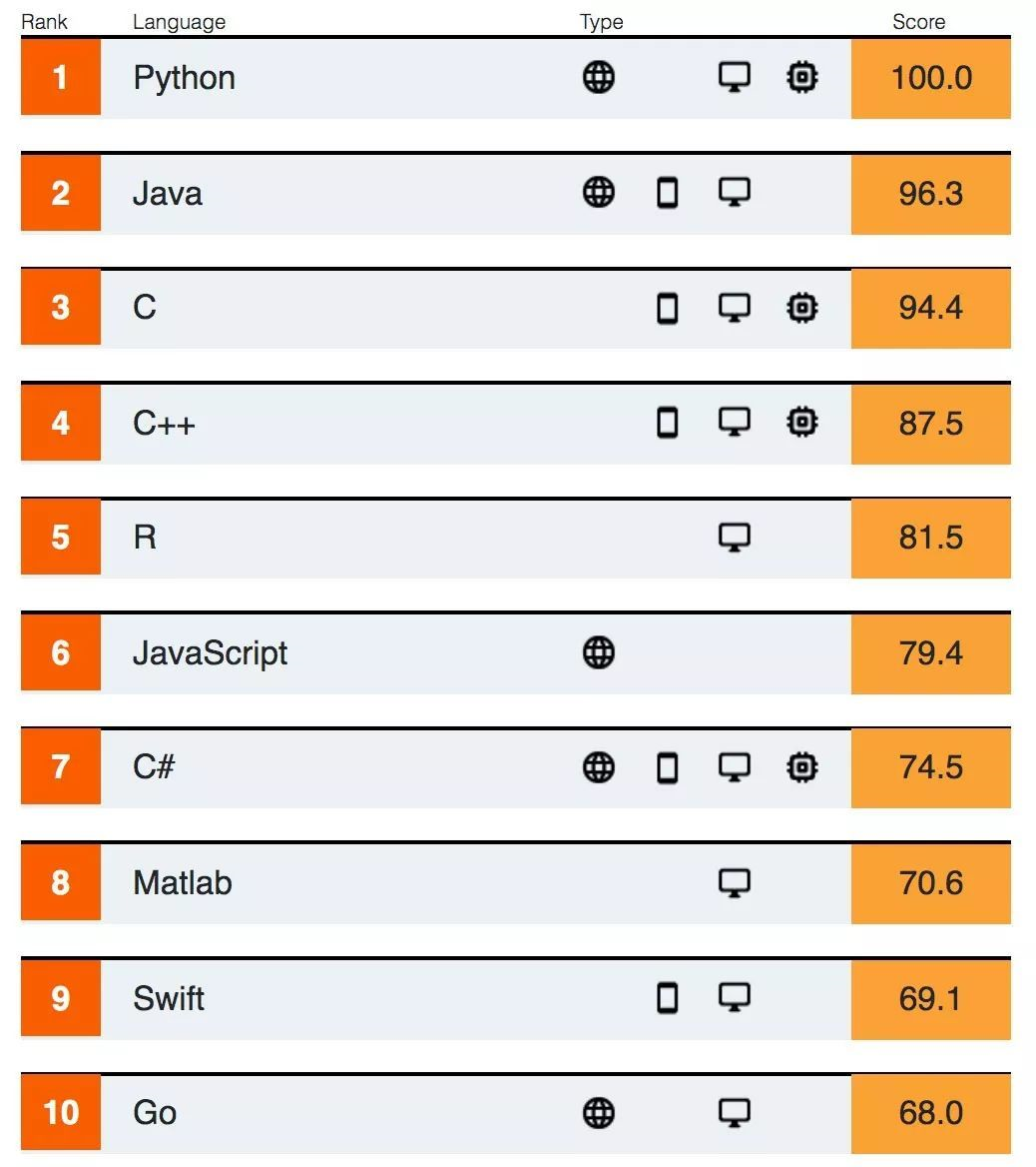IEEE Spectrum 2019 编程语言 Top10