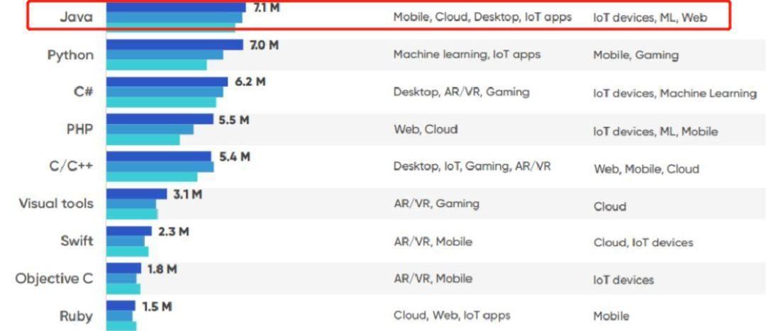 从以上3个榜单不难发现,同为面向对象编程的两种语言Java和Python都跳不出前3名。Java依然是目前最广泛使用的编程语言,在Web,Android,大数据以及各种后端开发领域都有广泛的用户基础,可以说Java语言的生态环境已经相当健全了。