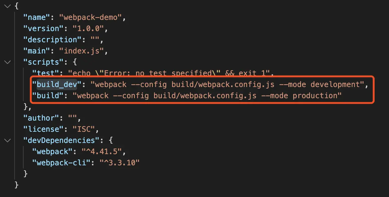 "build_dev": "webpack --config build/webpack.config.js --mode development",