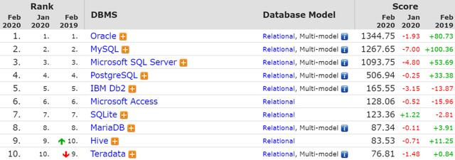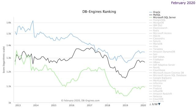 具体来看,前三名都出现了环比下降,Oracle 下降1.93分,MySQL下降了7分,Microsoft SQL Server 下降了 4.8分,但是Oracle同比分数则是上涨了 80 分,MySQL同比更是上升了100分: