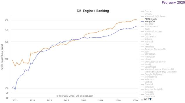 接下来是 PostgreSQL 和 MongoDB 的『绝代双骄』,从趋势上看,这仍然是最让人振奋的两个产品:(*点击图片查看大图)