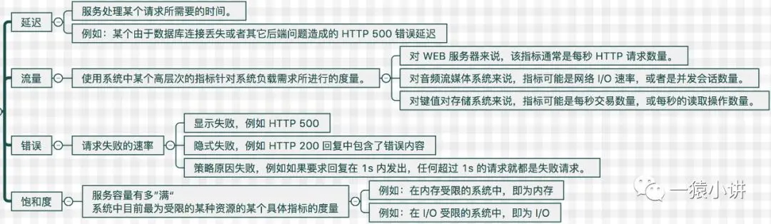 监控系统的四个黄金指标分别是延迟、流量、错误和饱和度。