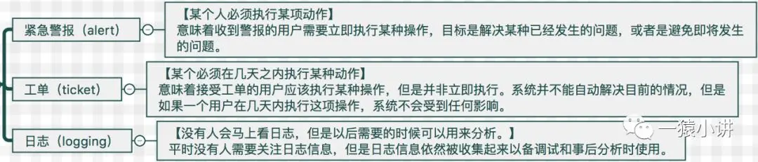 SRE 解密:这样的报警策略并不是非常有效:一个需要人工阅读邮件和分析警报,来决定目前是否需要采取某种行动的系统,从本质上就是错误的。监控系统,不应该依赖人来分析警报信息,而是应该由系统自动分析,仅当需要用户执行某种操作时,才需要通知用户。