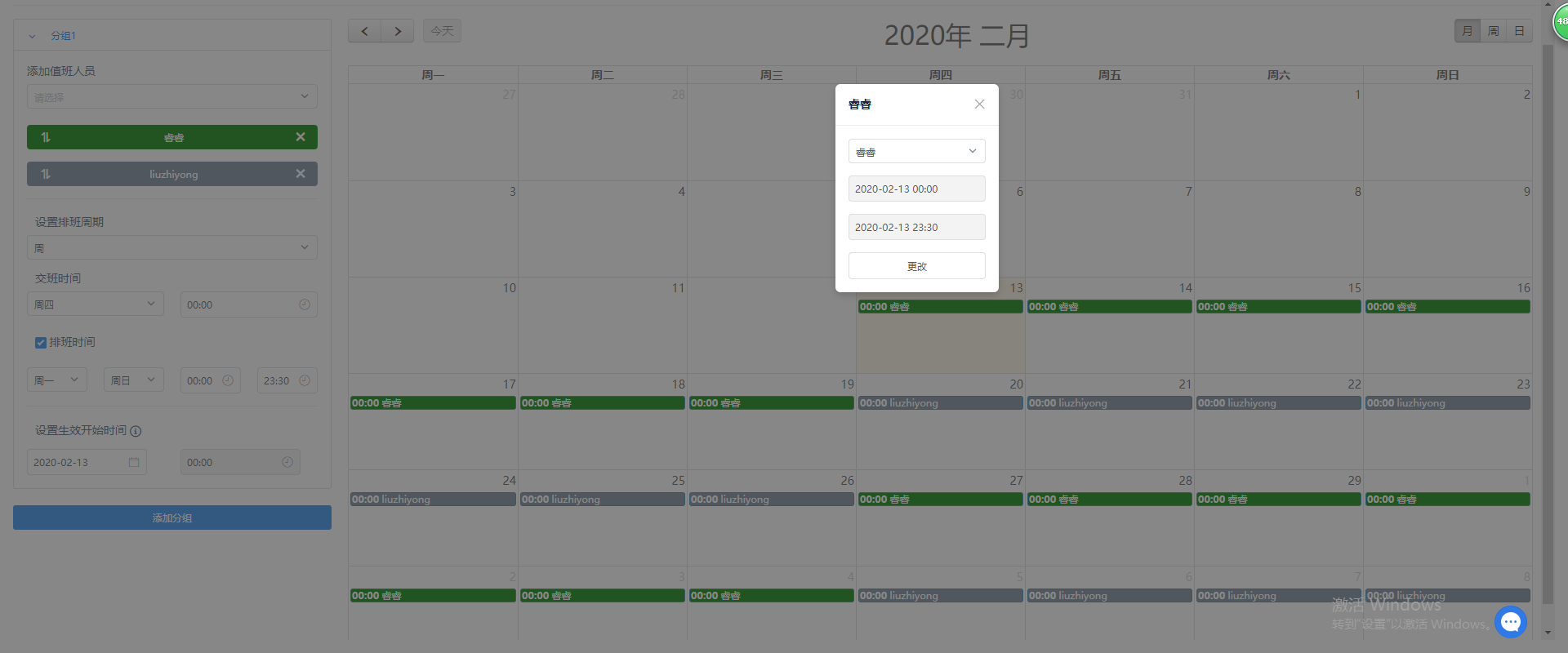 2.在右侧日历预览区域,点击待调整的人,在弹框中,选择替换值班的人,点击更改 按钮;