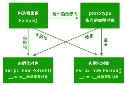 每个构造函数都有一个原型对象,原型对象上包含着一个指向构造函数的指针,而实例都包含着一个指向原型对象的内部指针。