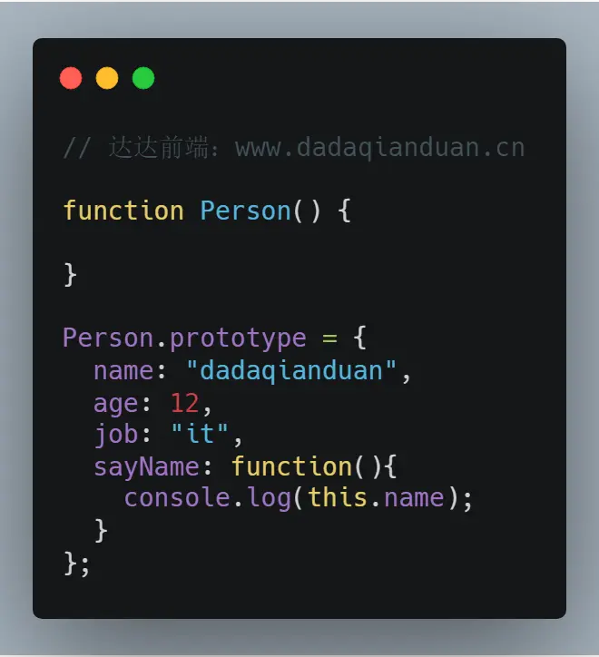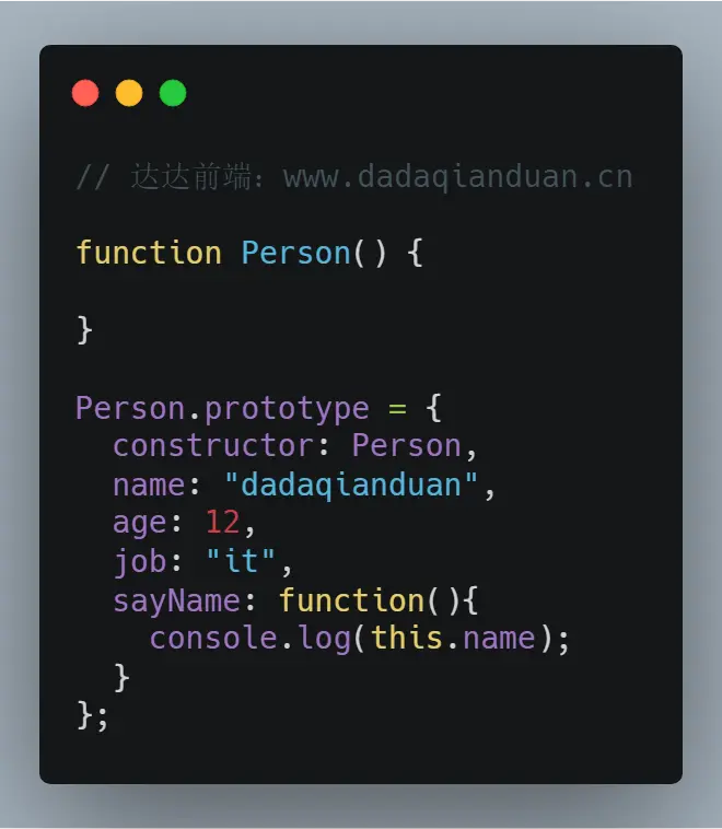 使用这个方法创建,以对象字面量创建新对象的形式,缺少了constructor属性的指向,不再指向Person了,每个函数新创建,就会同时创建一个prototype对象,这个对象会自动获得一个constructor属性。