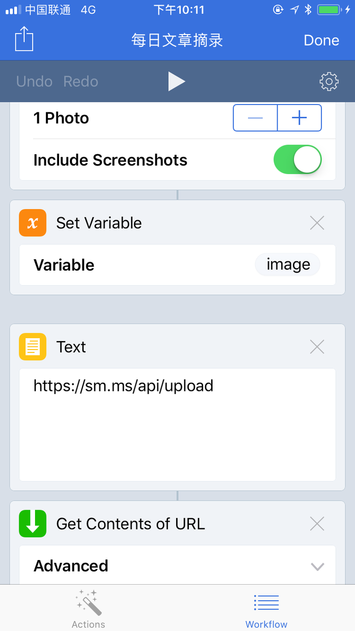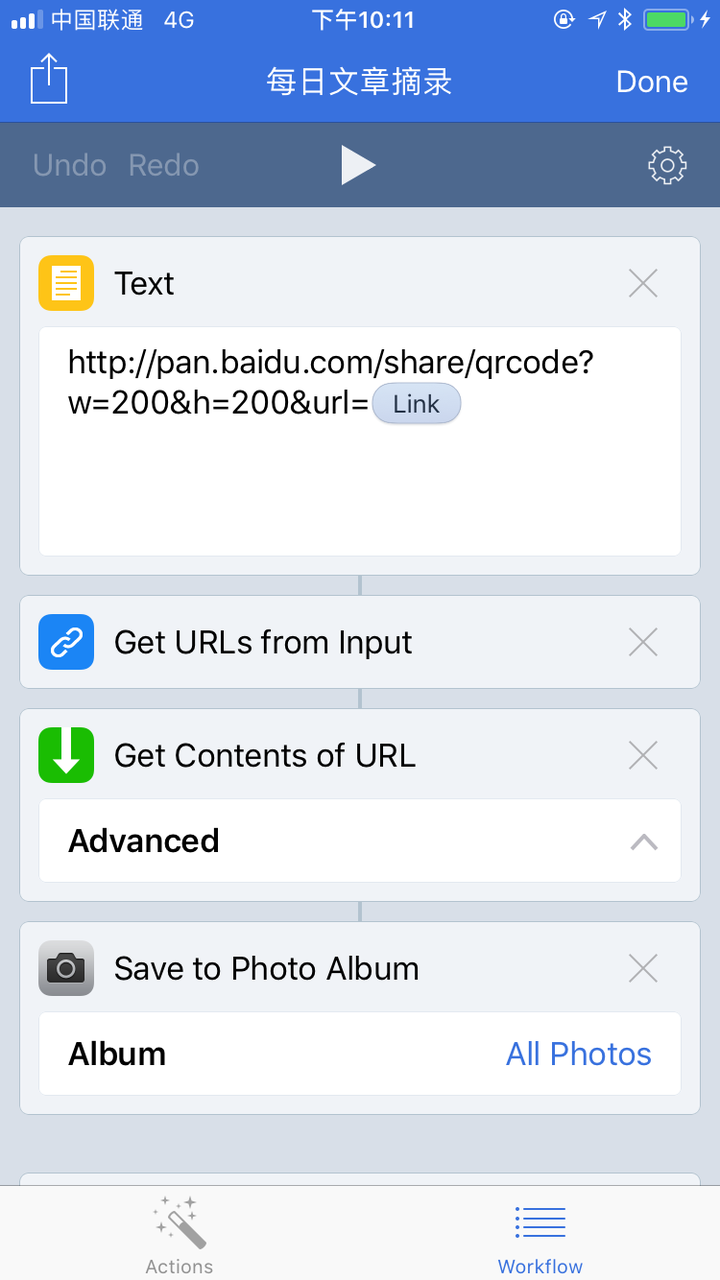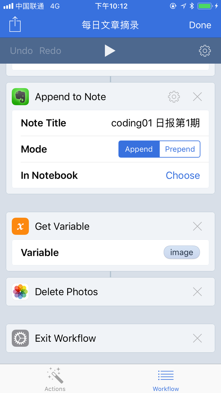我只需要「Workflow」 和「印象笔记」APP即可。整个过程是这样的: