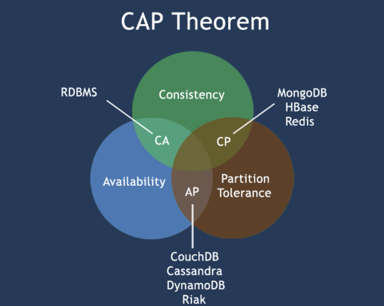 因此,根据 CAP 原理将 NoSQL 数据库分成了满足 CA 原则、满足 CP 原则和满足 AP 原则三大类:
