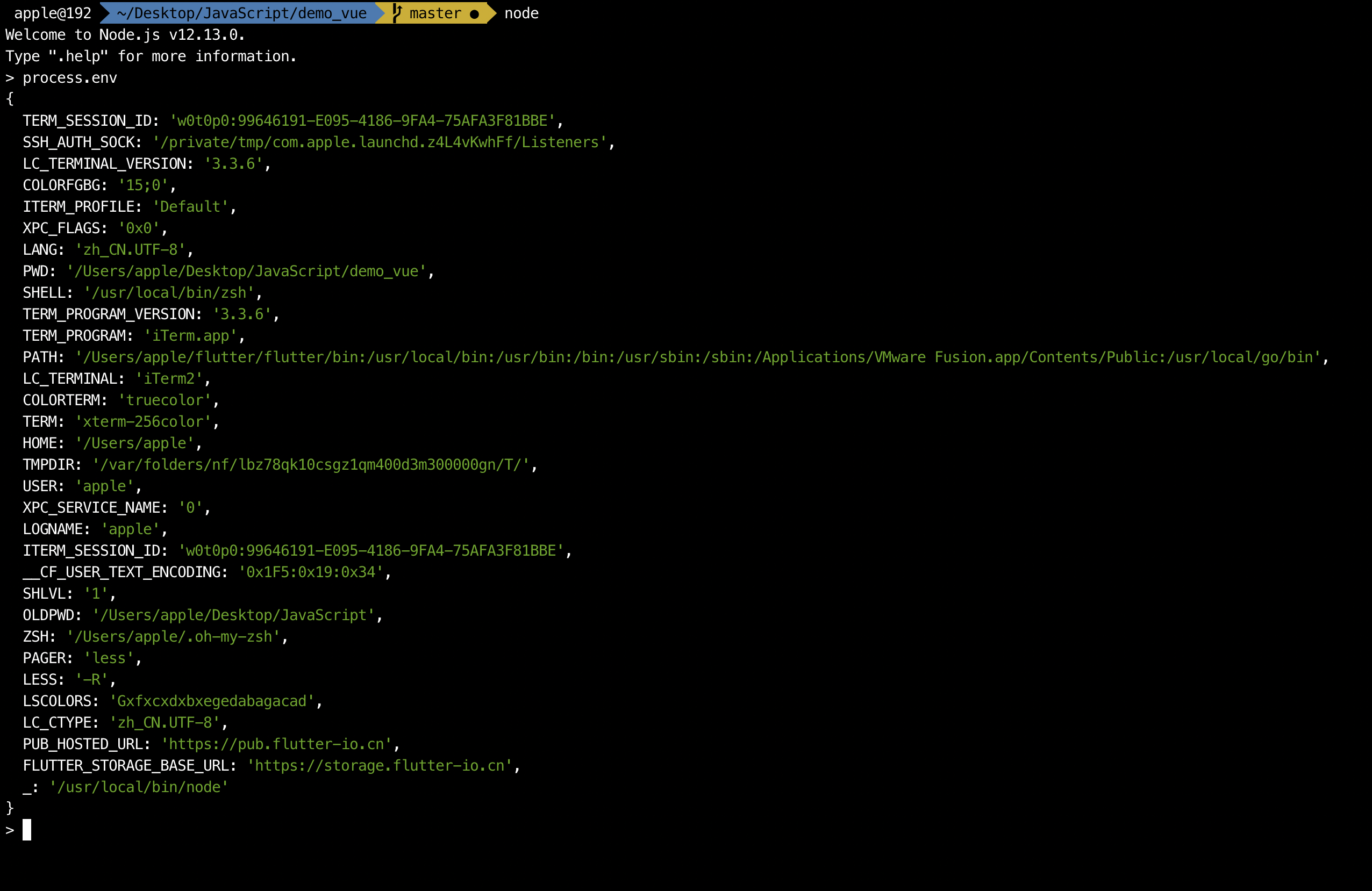 - 在终端输入node后,在输入process.env可以看到打印出来的信息