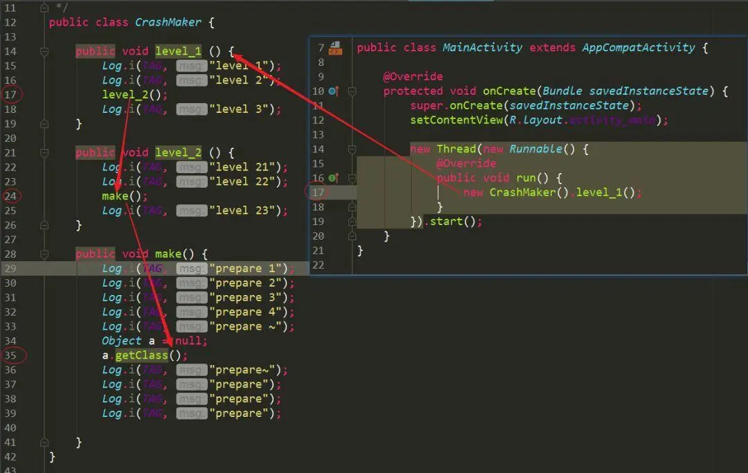 这里为什么要把类名和方法名用杂乱无章的字符代替呢?一方面原因就是后者 更精简,在dex文件中占用的空间更小,但这不是今天讨论的重点。上面Crash信息的后面指明了Crash的具体位置是第 26 行,这是不是说明了dex存在一些信息,指明了字节码位置到源代码位置的信息,进一步,我们是不是可以参考上面混淆之后通过map映射找到原来的类的做法,把字节码位置到源代码位置的信息作为map存在本地!!