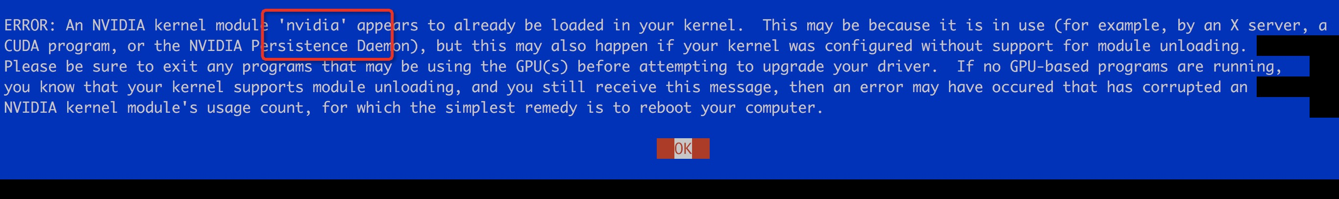 经过多次百度,谷歌各种方法发现都无法解决,什么内核版本不对啊之类的。然后我就纳闷了怎么安装驱动之后还好好的,我准备部署项目了就挂掉了呢。最后发现原因就出在我安装cuda10.0的步骤上出了问题。在安装cuda10.0时,**会再一次安装NVIDIA驱动!**就是这重复安装驱动导致了驱动挂掉了