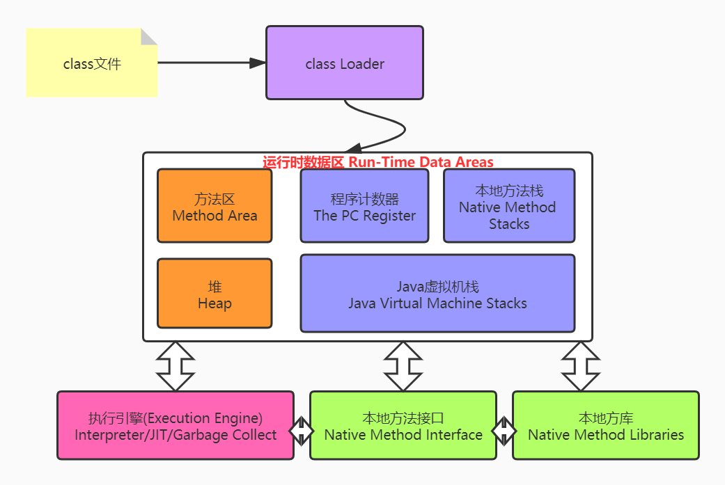 在之前的我们画过一张图,是从class文件到类装载器,再到运行时数据区的过程。今天把这张图进行升级,画一张完整的JVM大体的物理结构图。