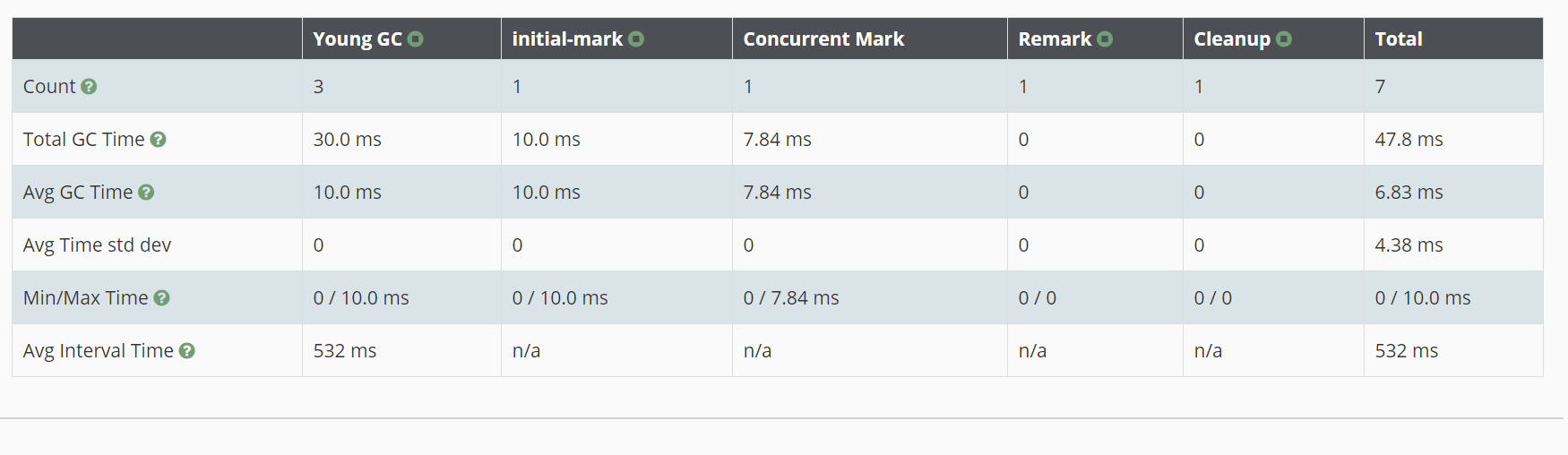 Throughput Min Pause Max Pause Avg Pause GC count