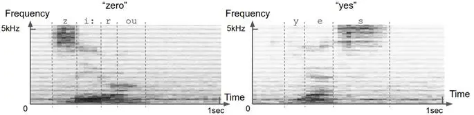 图4.12 语音“zero”和“yes”的示例频谱图。频谱图是声音的联合时频表示。您可以将频谱图视为以图像表示的声音。沿时间轴的每个切片(即图像的一列)都是时间上的一小段瞬间(帧);沿着频率轴的每个切片(即图像的一行)对应于特定的狭窄频率范围(音高)。图像每个像素处的值表示给定时间点在给定频率仓中声音的相对能量。绘制以上的频谱图,使较深的灰色阴影对应于更高的能量。不同的语音具有不同的定义特征。例如,诸如“ z”和“ s”之类的稳定辅音的特征在于准稳态能量集中在2-3 kHz以上的频率上。元音(如“ e”和“ o”)的特征在于频谱低端(<3 kHz)的水平条纹(即能量峰)。这些能量峰值在声学中称为“共振峰”。不同的元音具有不同的共振峰频率。不同的语音的所有这些鲜明特征都可以被深层的卷积网络用于单词识别。