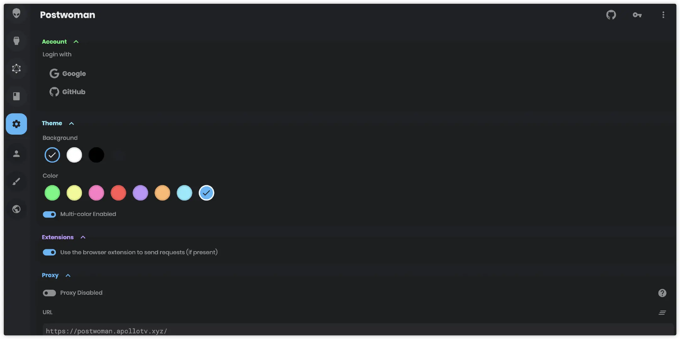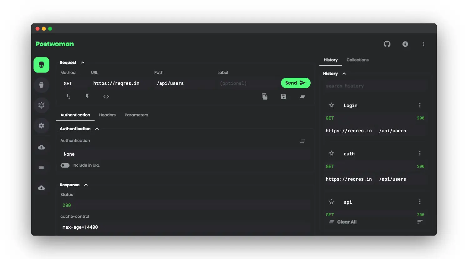 postwoman 本地会保存的执行历史请求记录,我们可以根据需要保存请求到 Collections 中。另外可以使用 Github/Google 登录,历史记录与 Collections 都可以实时同步到云端。