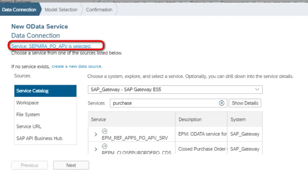 从service catalog的下拉菜单里选择刚刚创建的Destination,能带出该Destination指向的ES5服务器上部署的所有OData服务: