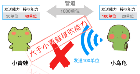在上图中,“小青蛙”的接受能力是 40 单元,“小乌龟”的发送能力是 100 单元,管道的传输能力是 1000 单元。这个时候,“小乌龟”发送了一个100 单元给“小青蛙”,此时发送的大小超过了“小青蛙”的接收能力。