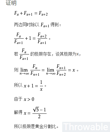 有趣的是,这样一个完全是自然数的数列,通项公式却是用无理数来表达的。而且当n趋向于无穷大时,前一项与后一项的比值越来越逼近0.618(或者说后一项与前一项的比值小数部分越来越逼近0.618),而这个值0.618就被称为黄金分割数。证明过程如下: