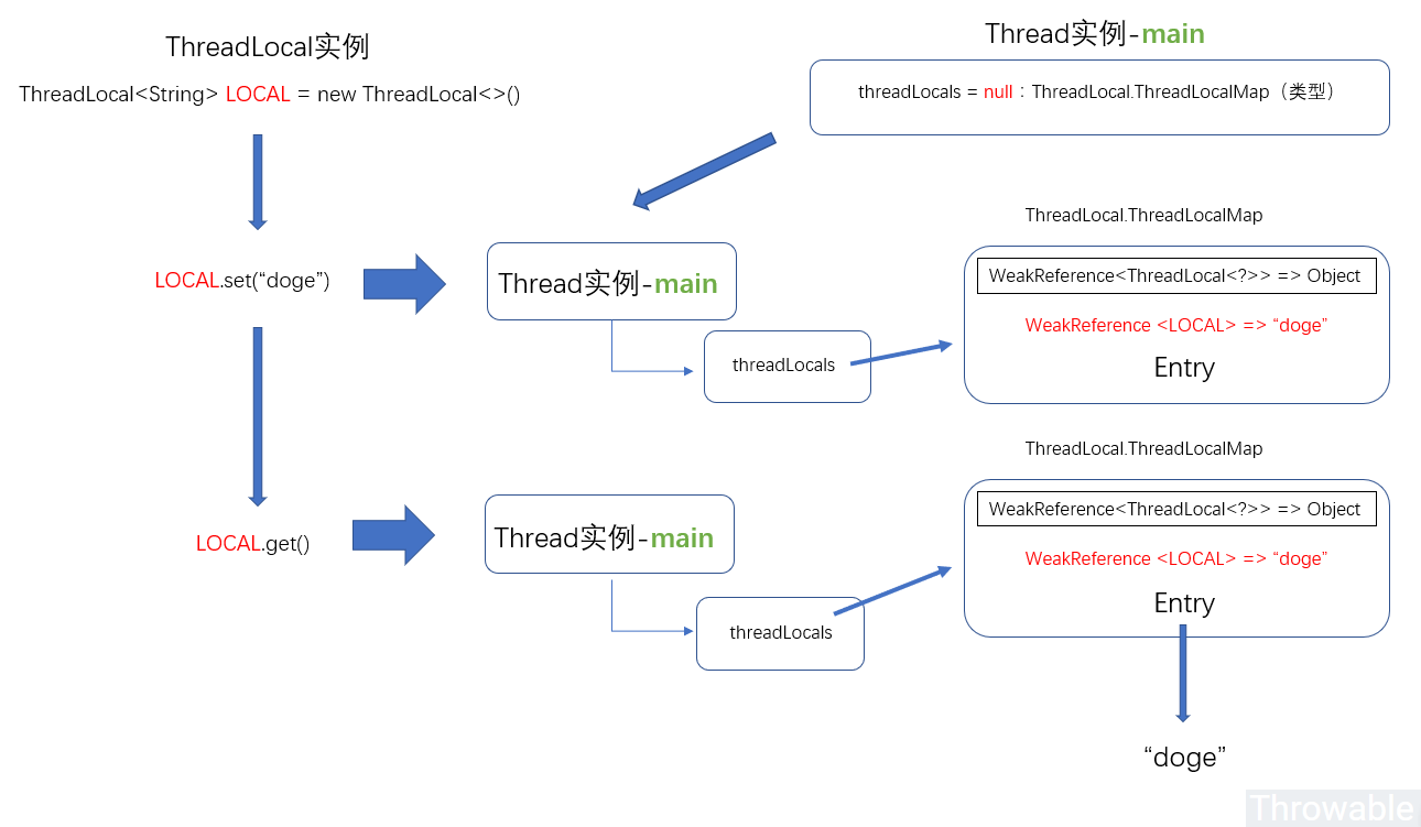 线程实例和ThreadLocal实例的关系如下:
