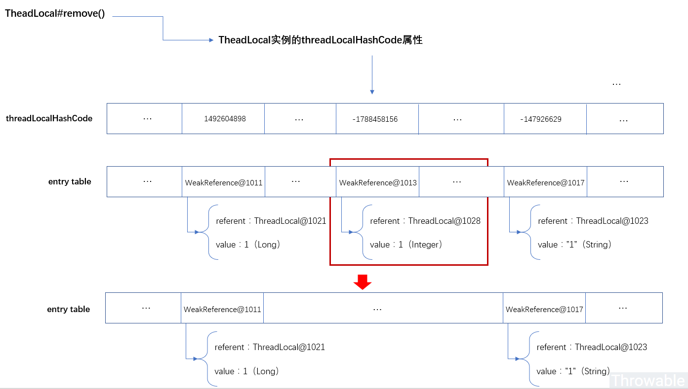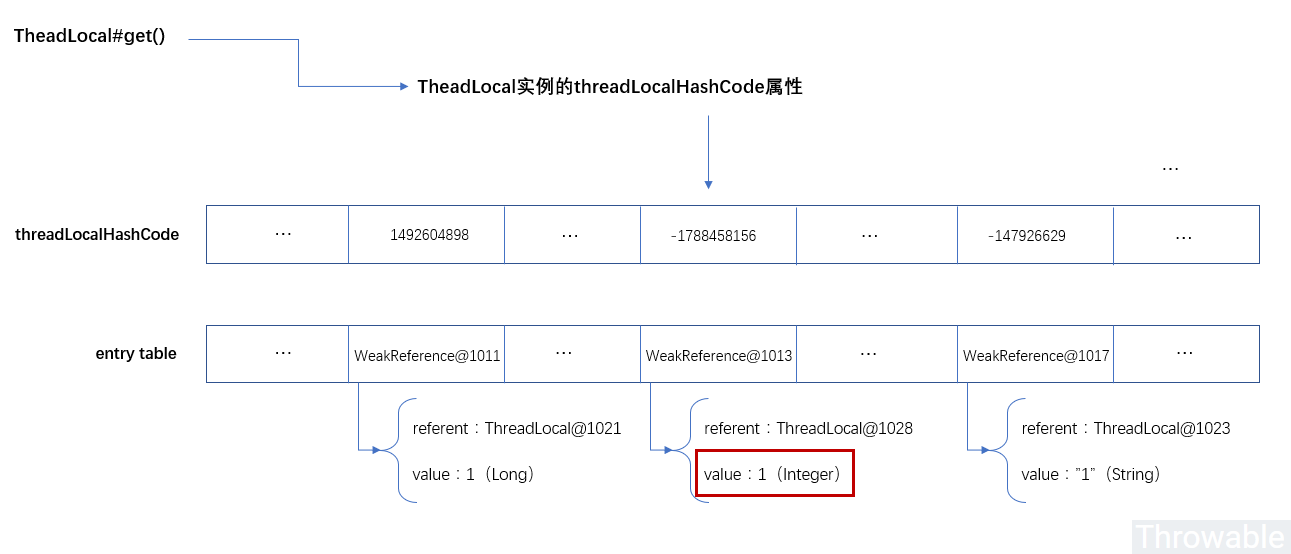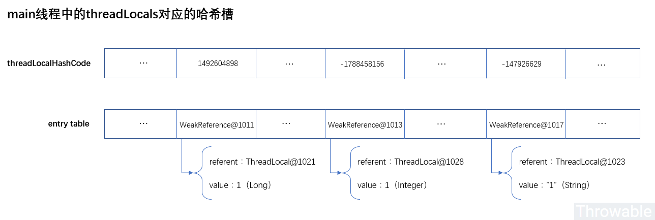 上图threadLocalHashCode属性一行的表是为了标出每个Entry的哈希槽的哈希值,实际上,threadLocalHashCode是ThreadLocal@XXXX中的一个属性,这是很显然的,本来threadLocalHashCode就是ThreadLocal的一个成员变量。
