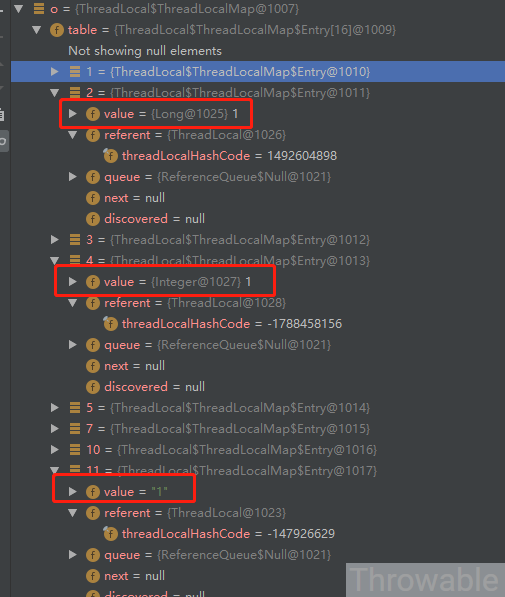 实际上,主线程的threadLocals属性中的哈希表中一般不止我们上面定义的三个ThreadLocal,因为加载主线程的时候还有可能在其他地方使用到ThreadLocal,笔者某次Debug的结果如下: