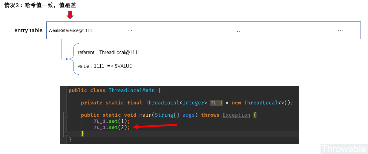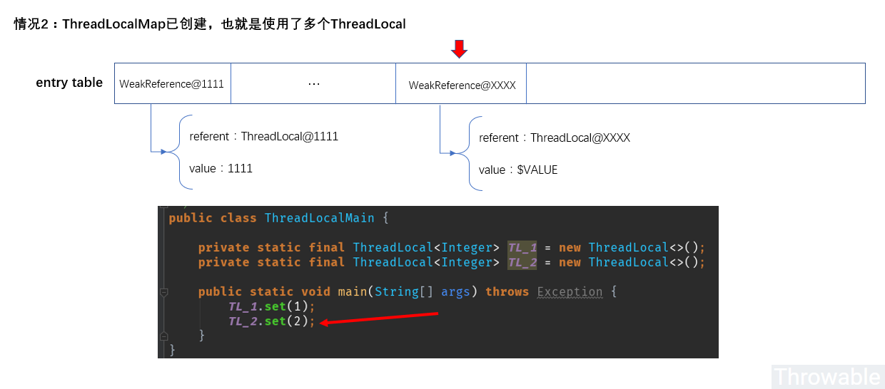 这种情况下,TL_1这个ThreadLocal在主动GC之后,线程绑定的ThreadLocal.ThreadLocalMap实例中的Entry哈希表中原来的TL_1所在的哈希槽Entry的引用持有值referent(继承自WeakReference)会变成null,但是Entry中的value是强引用,还存放着TL_1这个ThreadLocal未回收之前的值。这些被"孤立"的哈希槽Entry就是前面说到的要惰性删除的哈希槽。
