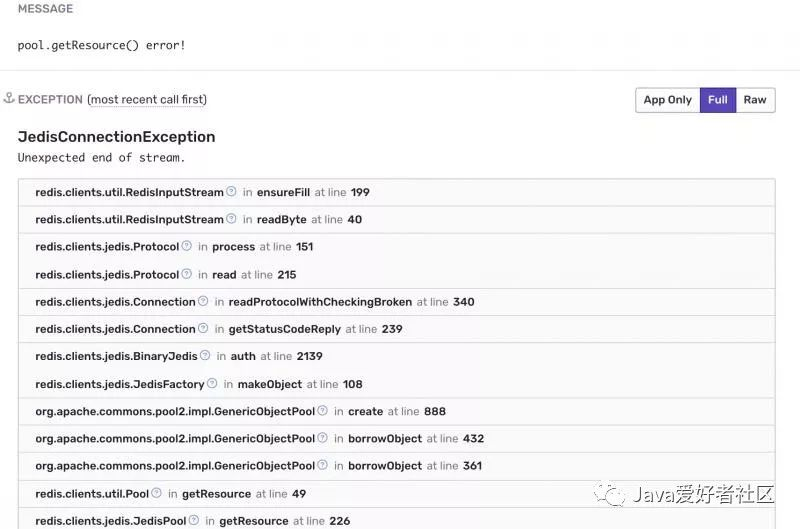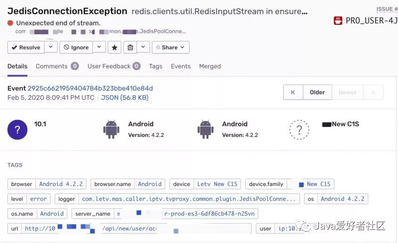 回到本文开头提到的 Sentry 告警的 JedisConnectionException 异常栈信息。
