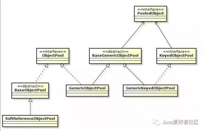 ObjectPool 和 KeyedObjectPool 是两个基础接口。从定义的接口名上也能做下区分,ObjectPool 接口资源池列表里存储都是对象,默认实现类GenericObjectPool,KeyedObjectPool 接口用键值对的方式维护对象,默认实现类是GenericKeyedObjectPool。在实现过程会有很多公共的功能实现,放在了BaseGenericObjectPool基础实现类当中。