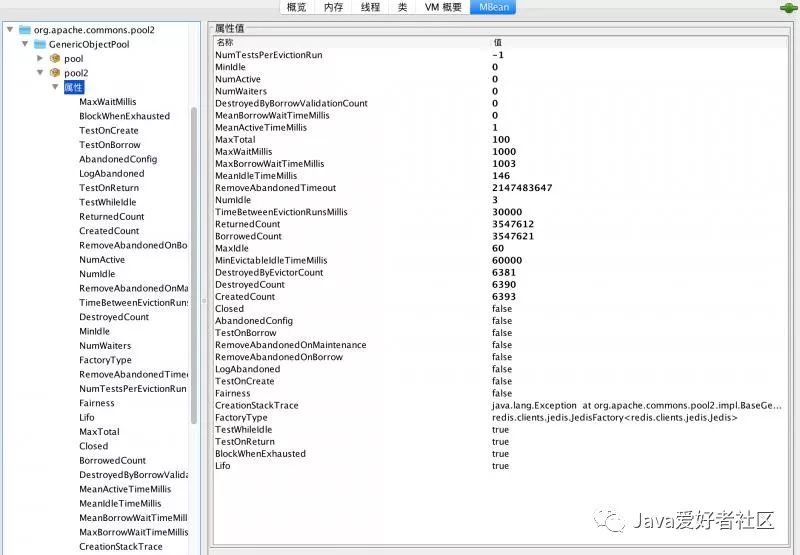 以上使用的是 Jconsole 工具类,点击 MBean 在左侧找到 org.apache.commons.pool2#GenericObjectPool#pool2 点击属性可以看到该类的所有属性信息,其中除包括核心的配置属性之外,还包括一些资源池的统计属性。