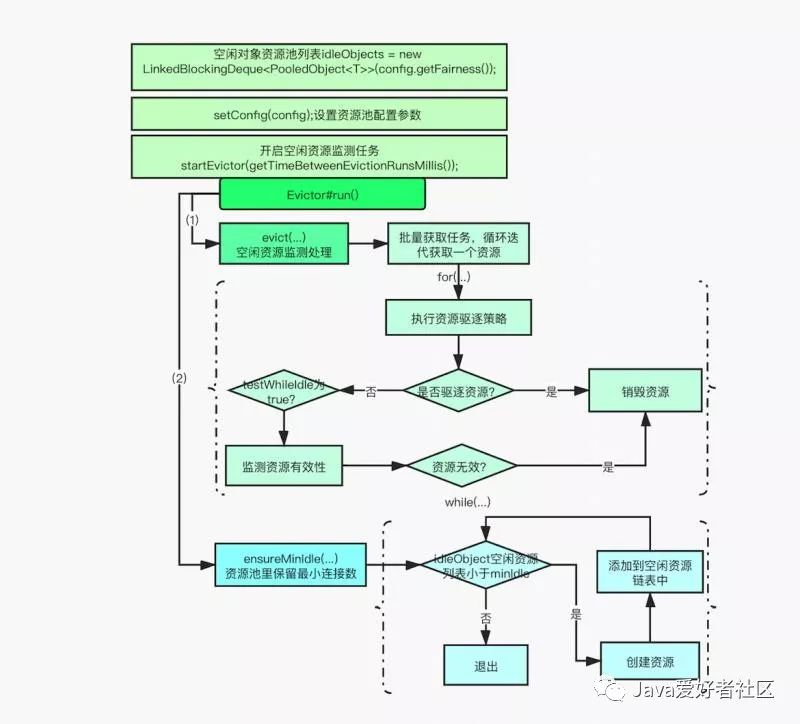public GenericObjectPool(final PooledObjectFactory<T> factory, final GenericObjectPoolConfig config) { super(config, ONAME_BASE, config.getJmxNamePrefix()); if (factory == null) { jmxUnregister(); // tidy up throw new IllegalArgumentException("factory may not be null"); } this.factory = factory; // 创建空闲资源链表 idleObjects = new LinkedBlockingDeque<PooledObject<T>>(config.getFairness()); // 初始化配置 setConfig(config); // 开启资源监测任务 startEvictor(getTimeBetweenEvictionRunsMillis()); }final void startEvictor(final long delay) { synchronized (evictionLock) { // 当资源池关闭时会触发,取消evictor任务 if (null != evictor) { EvictionTimer.cancel(evictor, evictorShutdownTimeoutMillis, TimeUnit.MILLISECONDS); evictor = null; evictionIterator = null; } if (delay > 0) { // 启动evictor任务 evictor = new Evictor(); // 开启定时任务 EvictionTimer.schedule(evictor, delay, delay); } } }