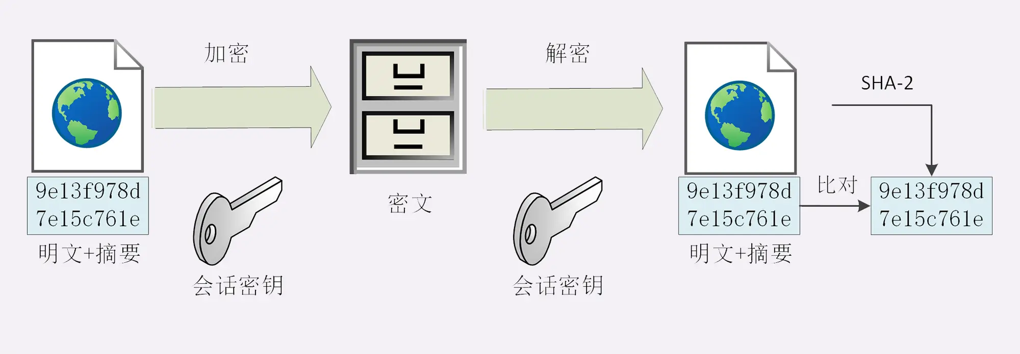 摘要算法保证了“数字摘要”和原文是完全等价的。所以,我们只要在原文后附上它的摘要,就能够保证数据的完整性。