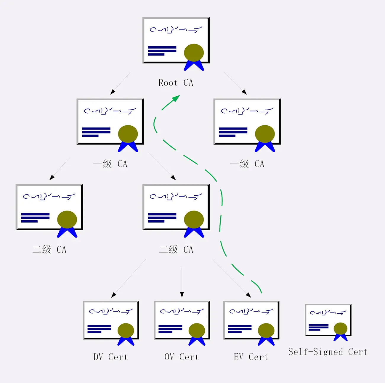 知名的 CA 全世界就那么几家,比如 DigiCert、VeriSign、Entrust、Let’s Encrypt 等,它们签发的证书分 DV、OV、EV 三种,区别在于可信程度。