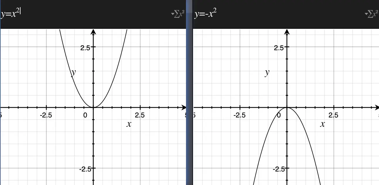 二次函数的图像是抛物线,如下图所示。我们会发现抛物线的凹凸(开口朝向)是通过上方式子中$a$的正负来决定的。