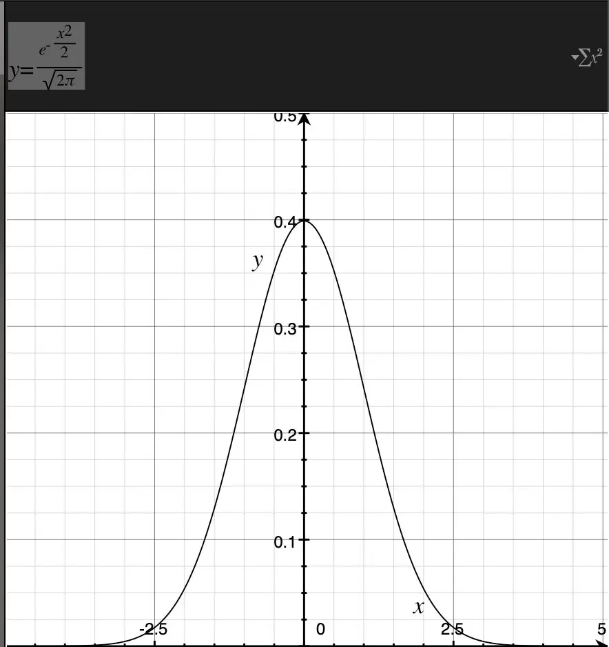 示例:试作出期望值$mu$为0、标准差$sigma$为1 的正态分布的概率密度函数的图像。?fleft( x right)=frac { 1 }{ sqrt { 2pi } } e^{ -frac { x^{ 2 } }{ 2 } }?