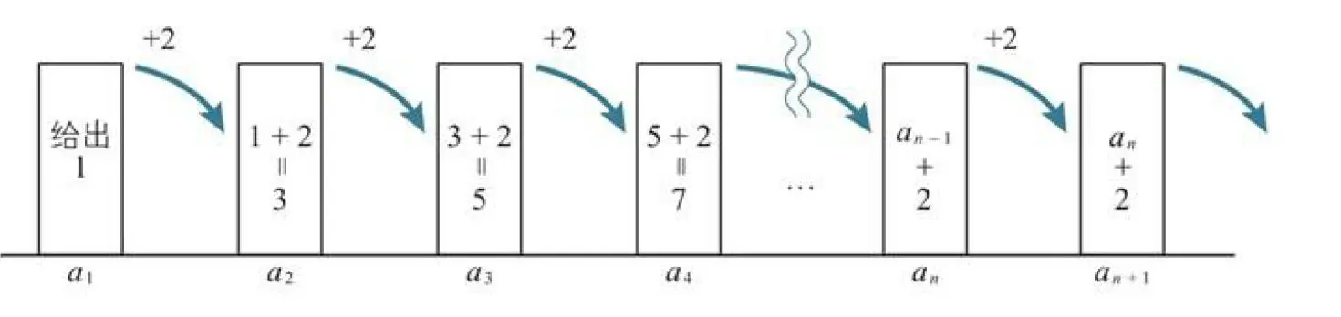 示例:已知首项$a_1=1$以及关系式$a_{n+1}=a_n+2$,可以确定以下数列,这个关系式就是数列的递推关系式。?a_{1}=1\\a_{2}=a_{1+1}=a_{1}+2=1+2=3\\a_{3}=a_{2+1}=a_{2}+2=3+2=5\\a_{4}=a_{3+1}=a_{3}+2=5+2=7\\...\\a_{1}=1,a_{n+1}=a_{n}+2?