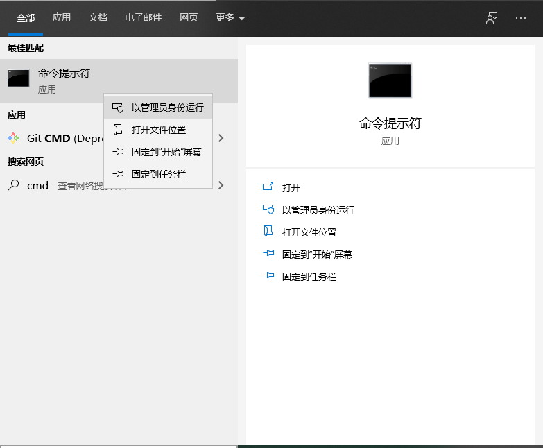 打开开始菜单,搜索命令提示符或者输入cmd,并以管理员身份打开