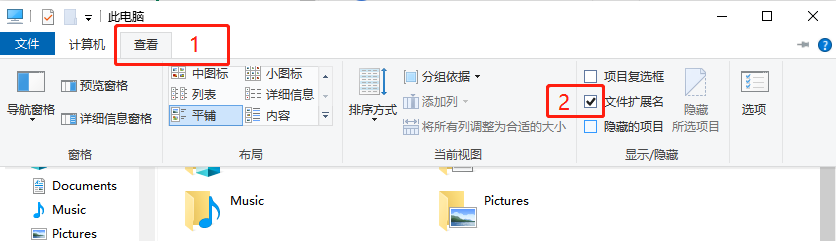 - 打开我的电脑->找到查看->勾选文件扩展名