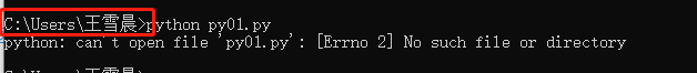- 这个时候提醒我们没有找到文件,为什么呢,因为我们当前所在的目录是C盘下的位置,而我们的文件却没有在这里