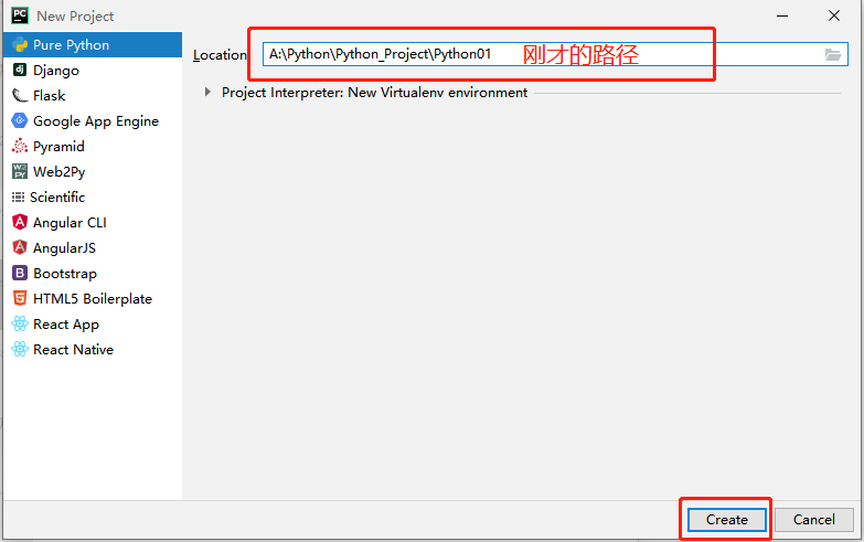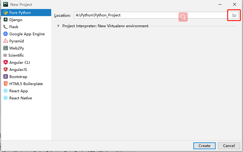 - 然后指定项目存放的路径,点击红框内文件夹图标,选择项目存放位置