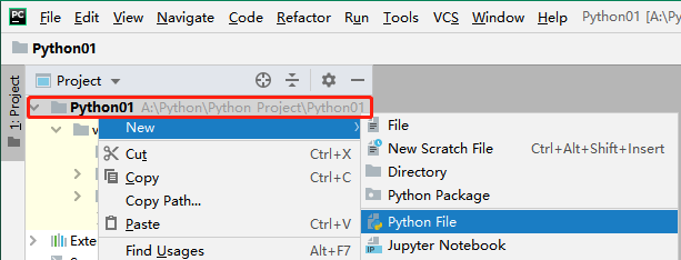 - 首先我们要创建一个Python文件,右击项目 -> New -> Python File -> 输入项目名字