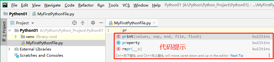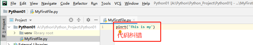 - 在编写代码区输入一下文本,当你开始输入的时候你就会发现、代码提示,当你把print输入错误的时候就会发现代码纠正