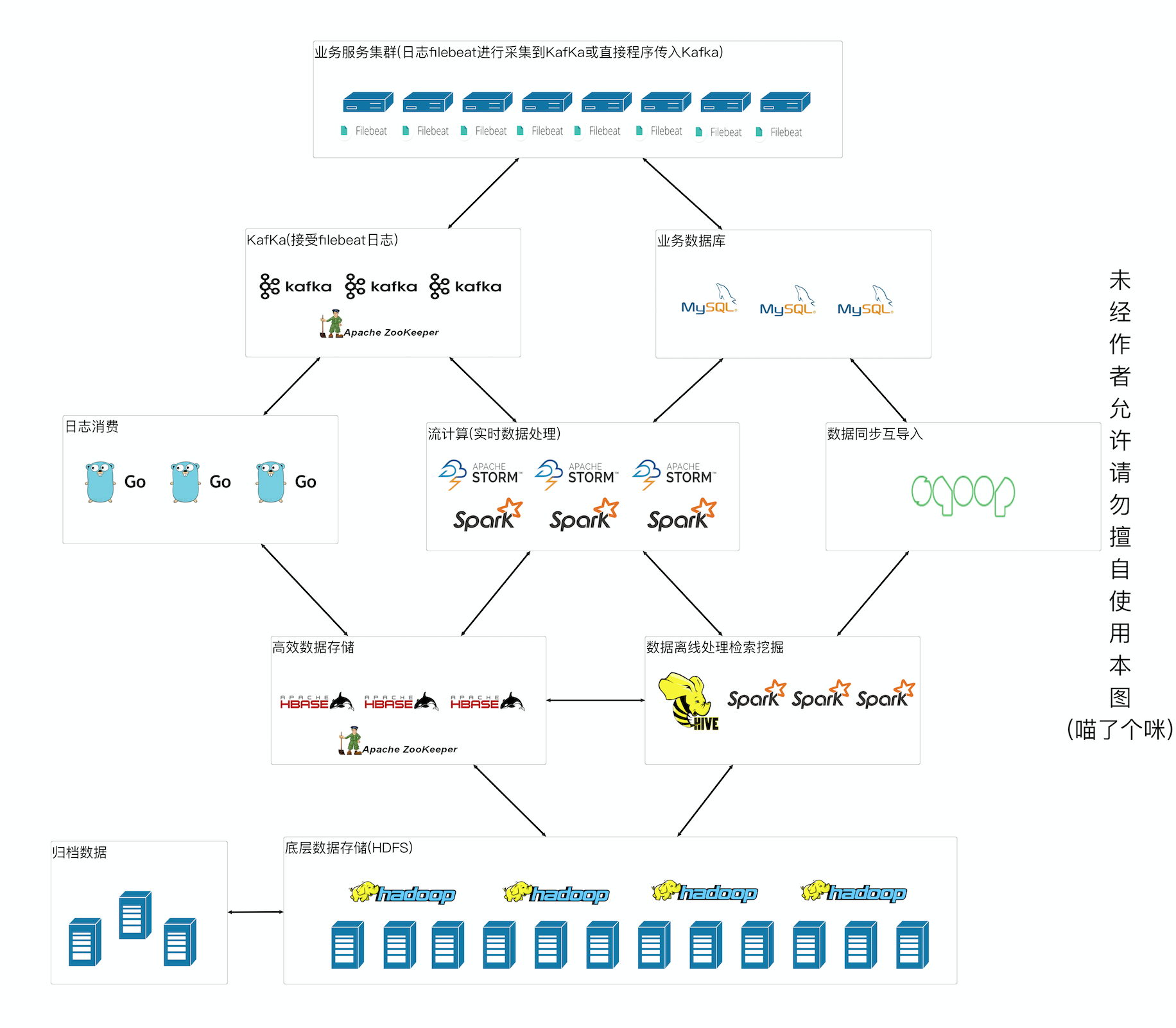 - 日志暂时存在KafKa中,分别被storm和Go程序消费(笔者后期会开源),storm试试计算处理到mysql库和hive库中