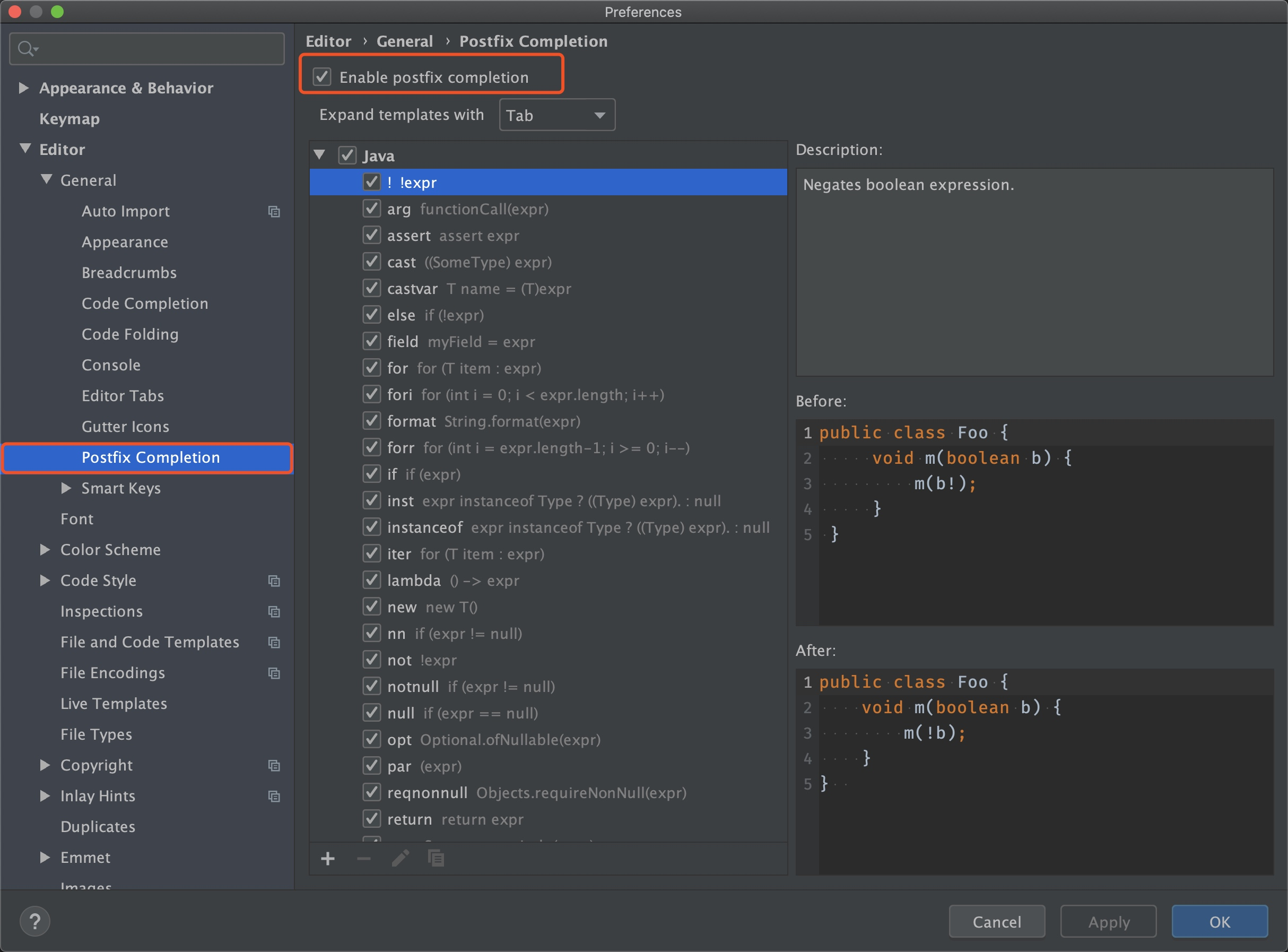 Postfix completion 本质上也是代码补全,它比 Live Templates 在使用上更加流畅一些,我们可以看一下下面的这张图。
