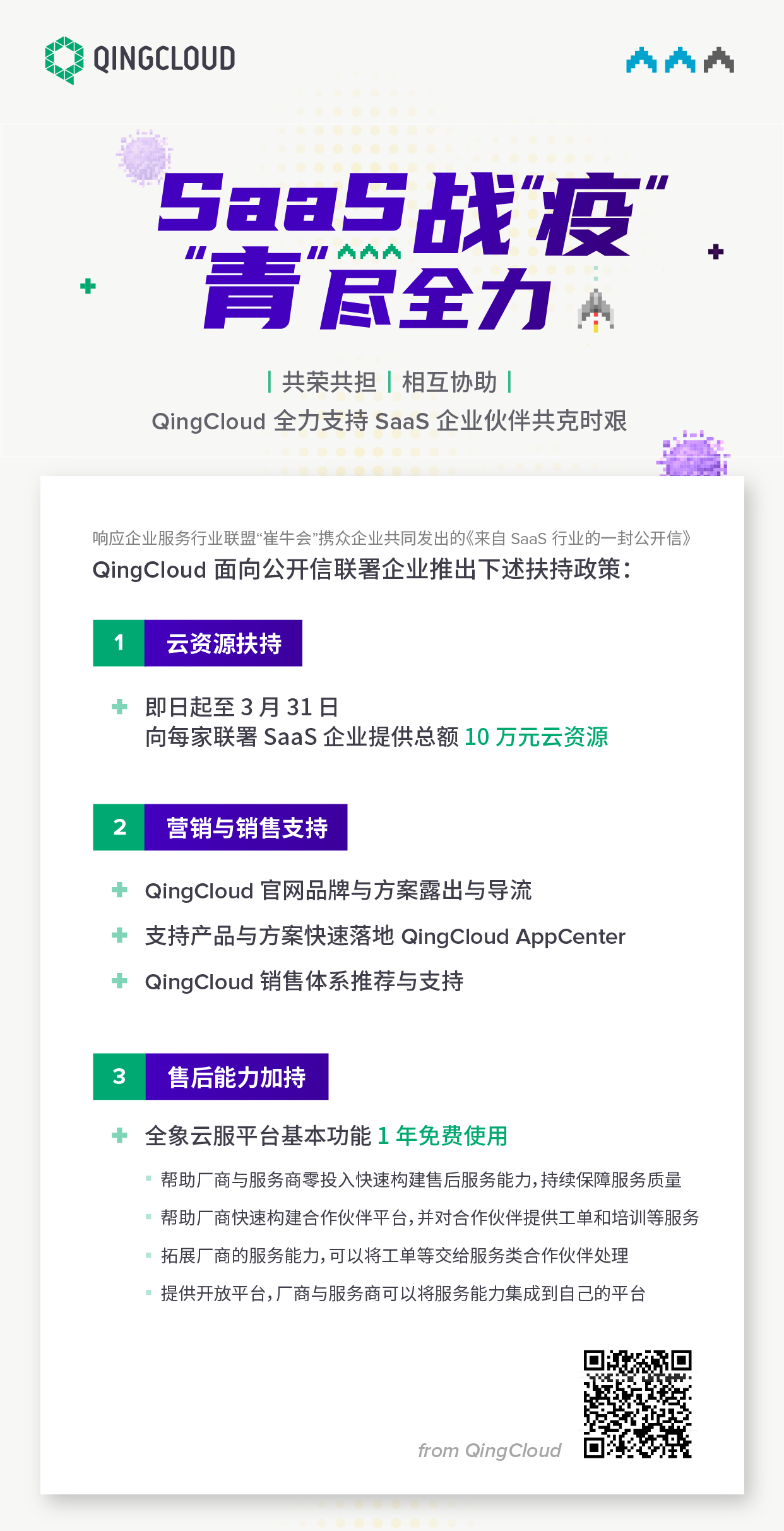 青云QingCloud 自 2012 年成立至今,一直坚持依托自身核心技术优势,从产品、服务、行业等多层面为企业级市场提供坚实的基础,推动国内 SaaS 产业的稳健发展。在本次疫情期间,青云QingCloud 希望贡献自己的一份力量,全力支持 SaaS 企业,与广大 SaaS 企业伙伴一起共抗疫情,同舟共济。