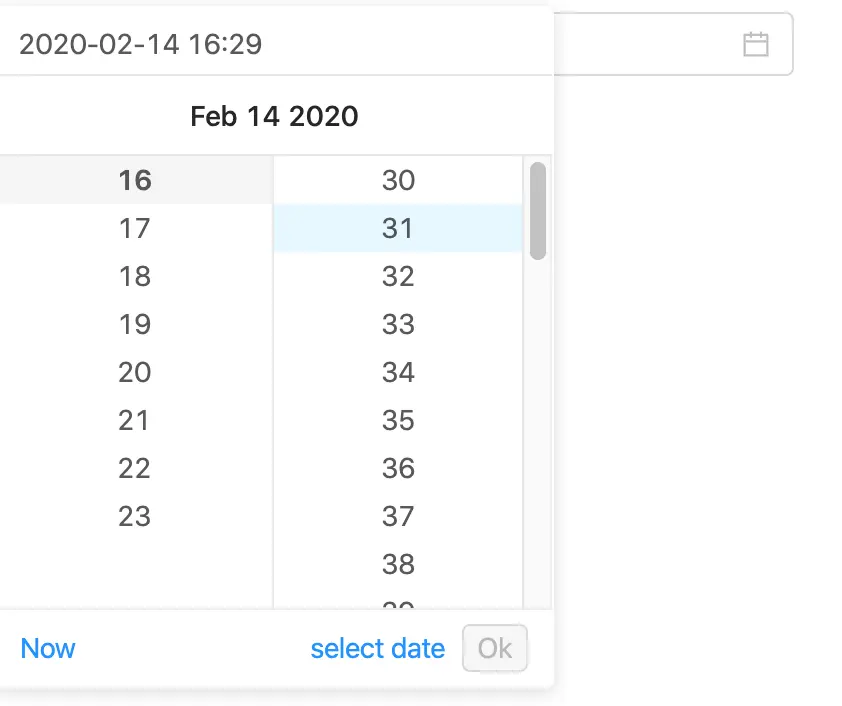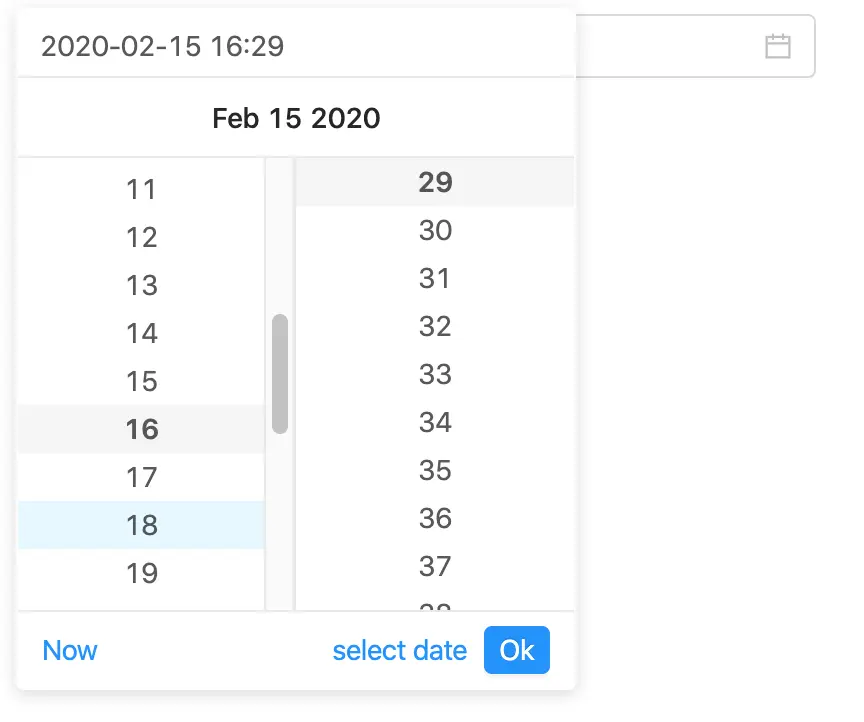 可以看到当选择今日也就是2月4日的时候,后面的时间显示为16时30分了,前面的0分-29分已经无法选择了,当日期切换到2月5日的时候,后面的选择时间轴却可以往上拖动,说明功能已经实现了!